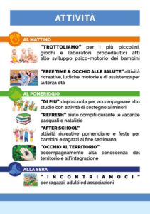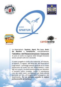In questo progetto è racchiusa tutta l’esperienza organizzativa dell’Ass Spartum famosa per i suoi successi e per saper coinvolgere giovani con lo sano sport che fa conoscere non solo attraverso il gioco ma con l’alta professionalità del proprio staff e delle proprie attività. Trovate tutta l’esperienza dell’Ass Agorà, otto anni di condivisione con enti , famiglie e scuola. Qui trovate la Pro Loco, una grande Associazione… ..la casa delle Associazioni, trovate gli Amici dei Bambini attenti alle esigenze delle famiglie e dei piccoli utenti e la fantasiosa Cambiscena teatro dell’improvvisazione. Non un semplice progetto , ma una struttura che nasce da esperienza e professionalità. Persone aperte alla condivisione e alla coprogettazione a sostegno della famiglia al completo: bambini, anziani, mamme, ragazzi e territorio.