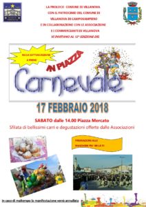 La Pro Loco di Villanova con il Patrocinio del Comune di Villanova di Camposampiero e in collaborazione con le Associazioni e i commercianti di Villanova vi invitano alla 12° edizione del Carnevale In Piazza, che si terrà sabato 17 Febbraio 2018 dalle ore 14.00 presso Piazza Mercato. Ci sarà un sfilata di bellissimi carri e degustazioni offerte dalle Associazioni, oltre ad una ricca sottoscrizione a premi e la premiazione alle più belle maschere!!!