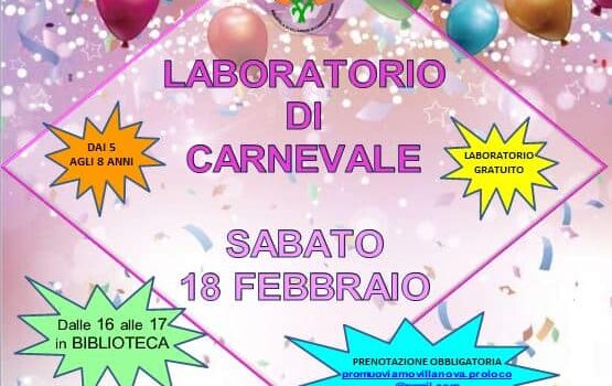 Sabato 18 febbraio ci sarà il laboratorio gratuito di Carnevale per i bambini dai 5 agli 8 anni dalle ore 16 alle 17 in Biblioteca di Villanova di Camposampiero presso Villa Ruzzini. Prenotazione obbligatoria inviando mail a promuoviamovillanova.proloco@gmail.com .