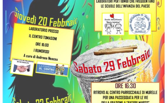 Anche quest’anno torna EL BATI MARSO!!! *Programma dei laboratori creativi* : GIOVEDÌ 20 FEBBRAIO ore 16.00 presso il Centro Tomasoni laboratorio a cura di Andrea Neacsu: I rumorosi! SABATO 22 FEBBRAIO ore 16.00 presso la Biblioteca Comunale di Villanova di Camposampiero laboratorio a cura di Creativity Lab! Per finire SABATO […]