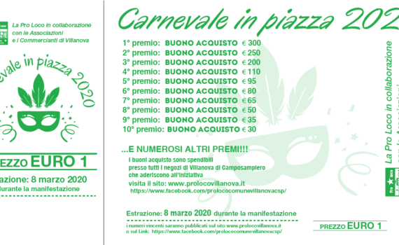 Nonostante sia stato annullato il Carnevale🎭🎨🎠, la lotteria c’è ancora e potete ancora acquistare i biglietti. I premi saranno dei buoni acquisto da spendere nei negozi di Villanova aderenti all’iniziativa. Per informazioni sull’acquisto dei biglietti: telefono: 049 922 2142 ; e-mail: segreteria@prolocovillanova.it ; recatevi sabato dalle 9:30 alle 12 presso […]