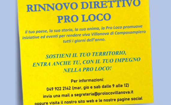 Prossimamente… ci sarà il rinnovo del Direttivo della Pro Loco del Comune di Villanova di Camposampiero. Il tuo paese, la sua storia, la sua anima, la Pro Loco promuove iniziative ed eventi per rendere viva Villanova di Camposampiero tutti i giorni dell’anno. SOSTIENI IL TUO TERRITORIO, ENTRA ANCHE TU, CON […]