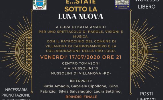 “E…state sotto la luna nuova” a cura di Katia Amadio, uno spettacolo di parole, visioni e musica, con il patrocinio del Comune di Villanova di Camposampiero e la collaborazione della Pro Loco di Villanova. Si terrà venerdì 17 Luglio 2020 alle ore 21:00 presso il Centro Tomasoni, via Mussolini 13, […]