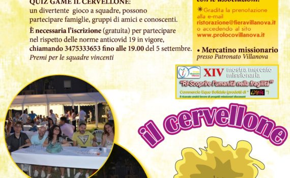 Durante la serata di sabato 5 Settembre ci sarà il QUIZ GAME IL CERVELLONE: un divertente gioco di squadre, in cui possono partecipare famiglie, gruppi di amici e conoscenti.